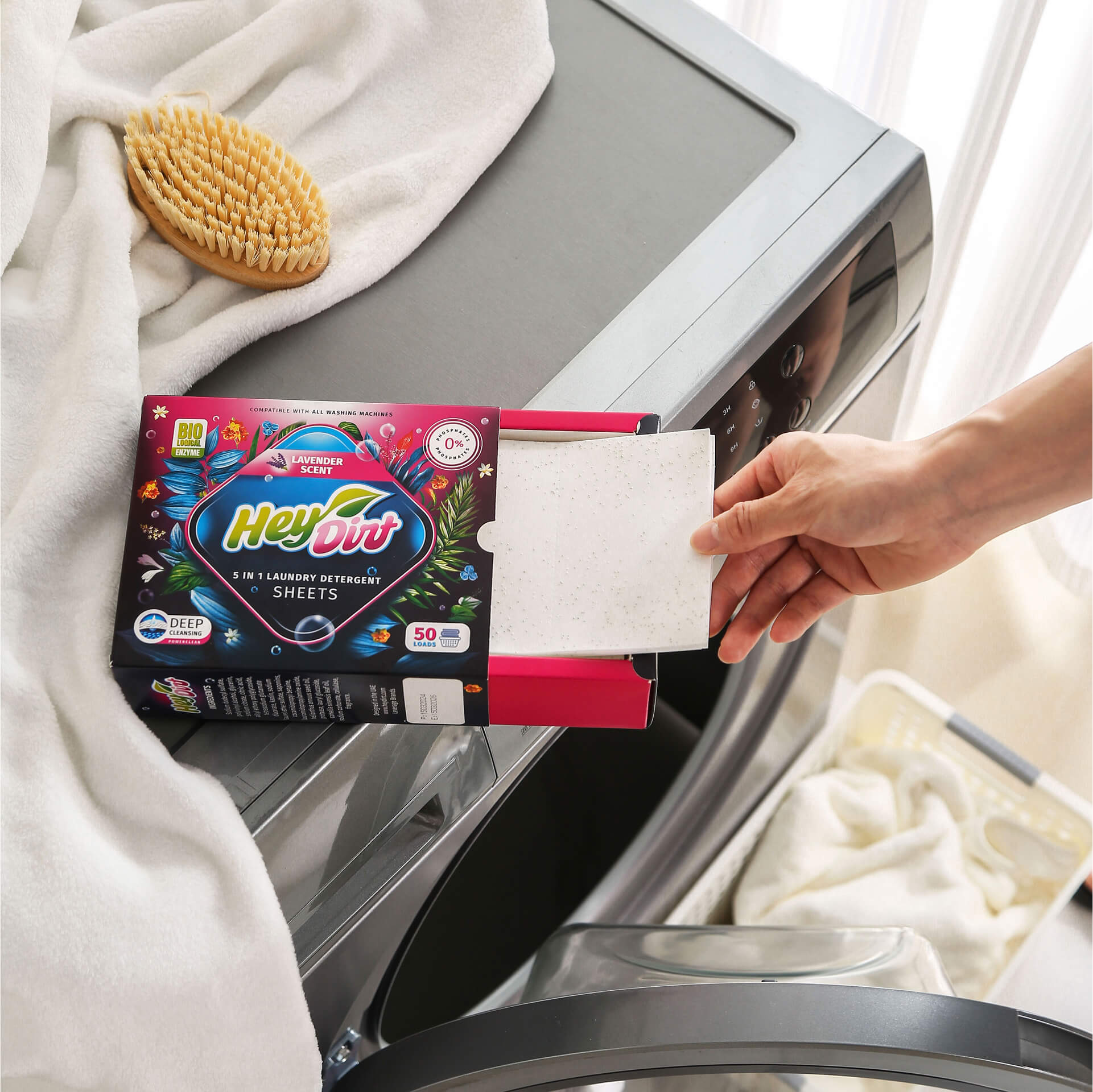 Begin the washing cycle, and let Hey Dirt’s convenient sheets do the work. Once the cycle is complete, your clothes will be clean and fresh without the mess of traditional detergent bottles.